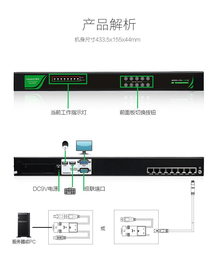 市場上分為低端KVM,中端KVM,和高端KVM另外有一款高端 LCD KVM中的直接整合LCD顯示屏,鍵盤和平板鼠標.