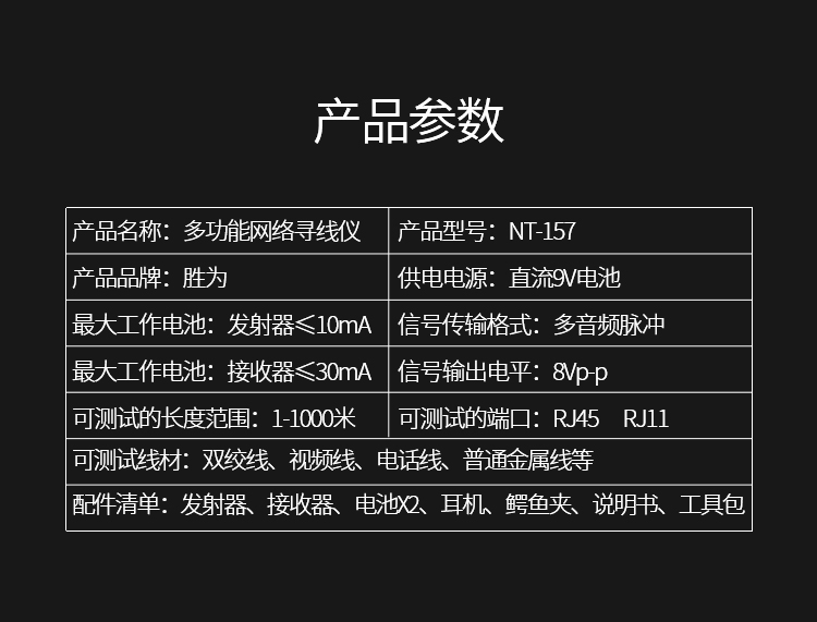 可測試線材:雙絞線、視頻線、電話線、普通金屬線等