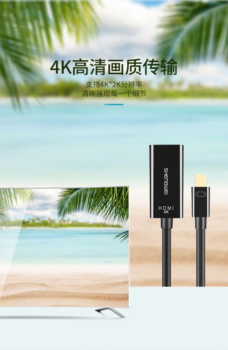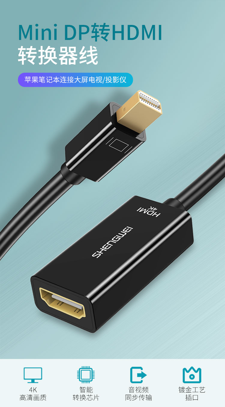 勝為Mini-DP轉(zhuǎn)HDMI轉(zhuǎn)換器 surface/蘋果筆記本雷電接口高清4K 防雷電轉(zhuǎn)HDMI公口-4K高清 1.8米 MN-2004