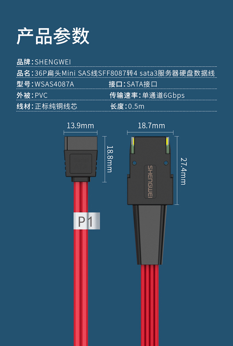 勝為36P Mini SAS線SFF8087轉(zhuǎn)4 sata3服務(wù)器硬盤數(shù)據(jù)線0.5米WSAS4087A
