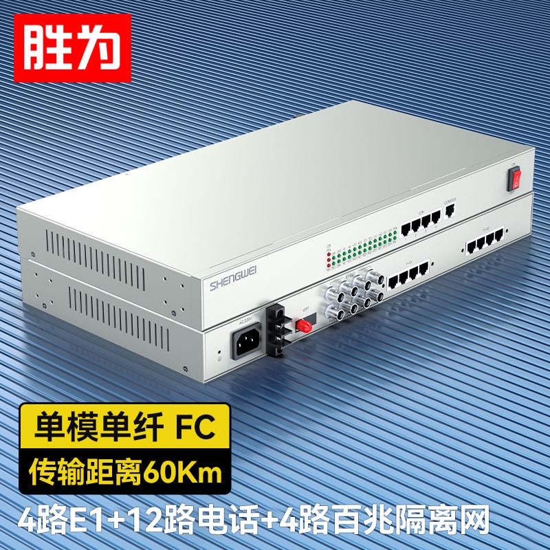 4路E1+12路電話+4路百兆隔離網(wǎng)絡(luò) 綜合業(yè)務(wù)電話光端機(jī) PCM語(yǔ)音光端機(jī) 60KM FC單纖桌面式 一對(duì) D4E12P09