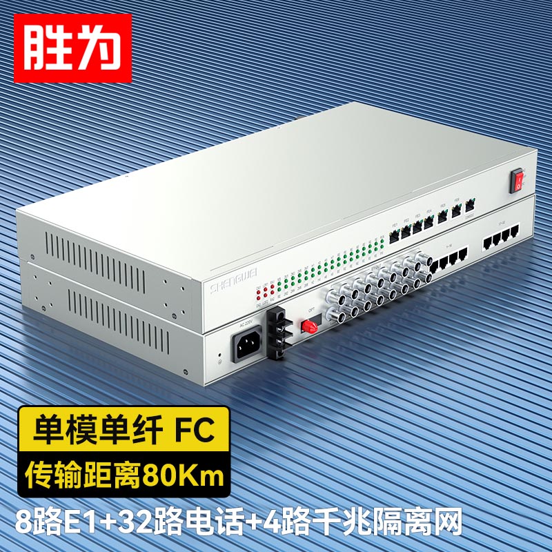 8路E1+32路電話+4路千兆隔離網絡 綜合業(yè)務電話光端機 PCM語音光端機 80KM FC單纖桌面式 一對 D8E32P21