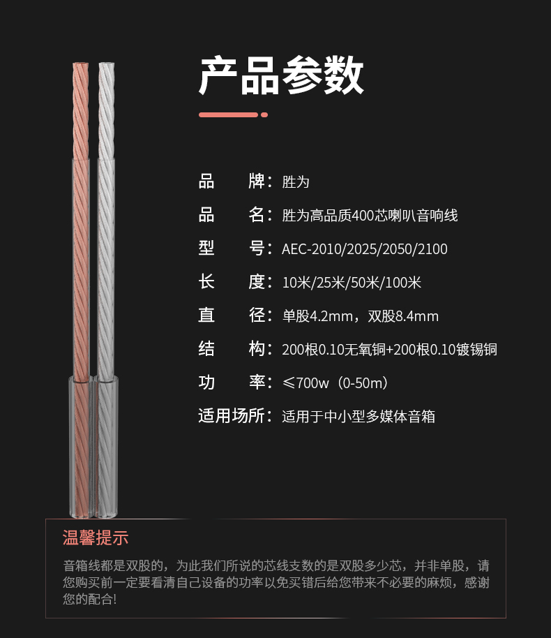 發(fā)燒級(jí)純銅音箱線 2*200芯 25米音頻線 功放音響喇叭連接線 勝為 AEC-2025
