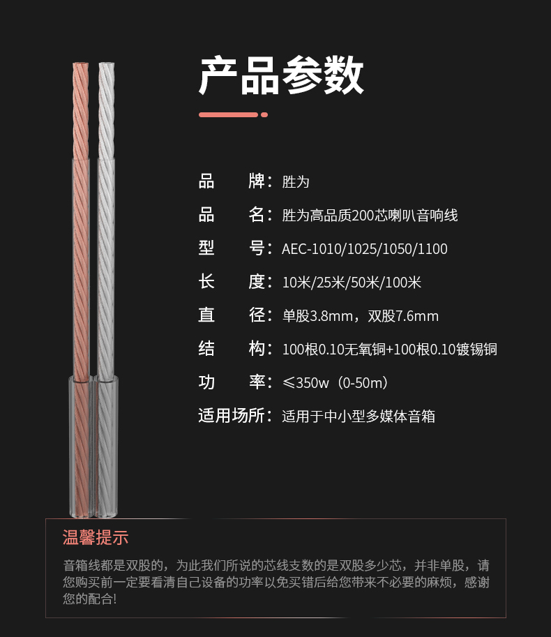 勝為發(fā)燒級音箱線 2*100芯音響線喇叭線音頻線 100米功放車載線 非屏蔽 AEC-1100